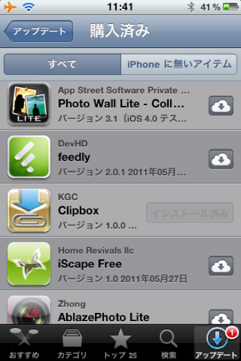 我が家は家族がそれぞれiPhone 3GS、 iPhone4、 iPad、 iPad2を使っていて各々インストールしているアプリも違うわけですが、同一のアカウントなのでそれらが全て(過去にダウンロードして削除してしまったものも含めて)一覧でズラズラ表示されるようになっています。